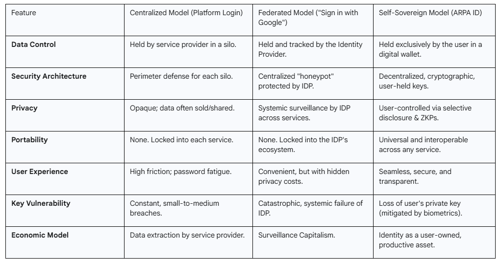 This comparative analysis makes the deficiencies of the current paradigms starkly apparent. The Self-Sovereign Model, exemplified by the ARPA ID framework, represents not an incremental improvement but a fundamental architectural shift. It moves the locus of control from the corporation to the individual, replaces centralized vulnerabilities with decentralized resilience, and, most critically, transforms the underlying economic model from one of extraction to one of ownership and agency.This comparative analysis makes the deficiencies of the current paradigms starkly apparent. The Self-Sovereign Model, exemplified by the ARPA ID framework, represents not an incremental improvement but a fundamental architectural shift. It moves the locus of control from the corporation to the individual, replaces centralized vulnerabilities with decentralized resilience, and, most critically, transforms the underlying economic model from one of extraction to one of ownership and agency.This comparative analysis makes the deficiencies of the current paradigms starkly apparent. The Self-Sovereign Model, exemplified by the ARPA ID framework, represents not an incremental improvement but a fundamental architectural shift. It moves the locus of control from the corporation to the individual, replaces centralized vulnerabilities with decentralized resilience, and, most critically, transforms the underlying economic model from one of extraction to one of ownership and agency.